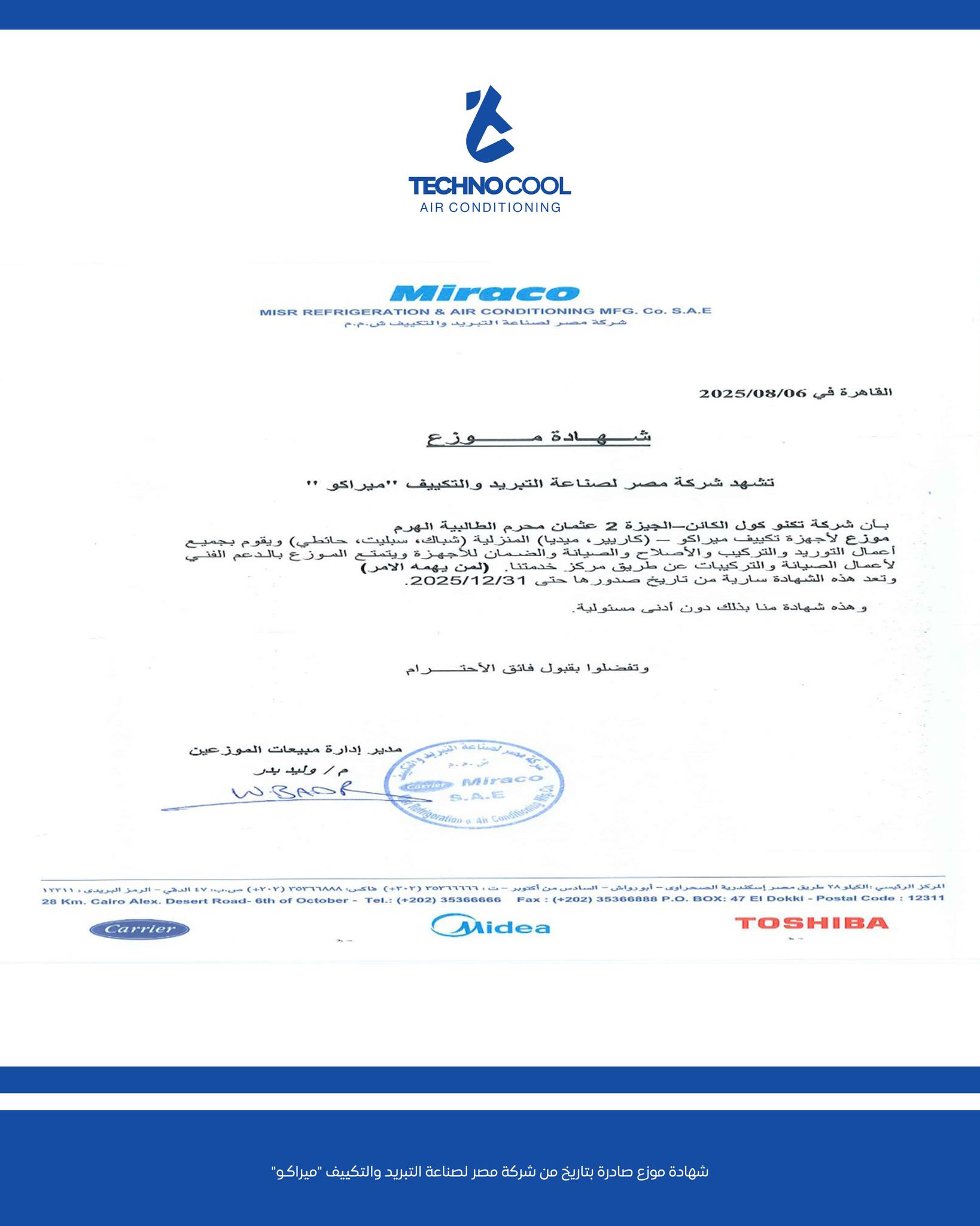 تعد شركة تكنوكول مصر موزعًا معتمدًا من شركة مصر لصناعة التبريد والتكييف “ميراكو”، وذلك لأجهزة تكييف كاريير وميديا بجميع أنواعها، حيث نقدم خدمات متكاملة تشمل التوريد والتركيب والصيانة والإصلاح، مع توفير دعم فني متخصص لضمان أعلى مستويات الأداء والراحة لعملائنا.